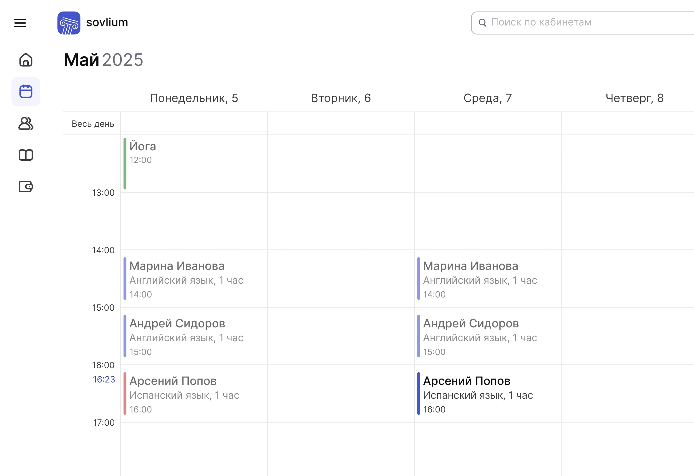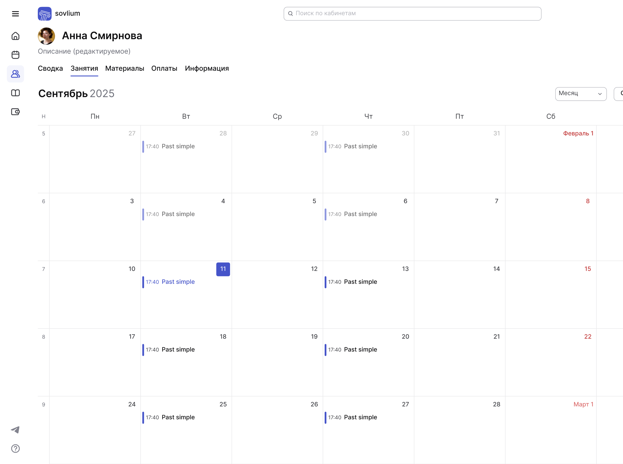 Легко переходите в карточку занятия, где хранятся все материалы и настройки. Остаётся только нажать «Начать»